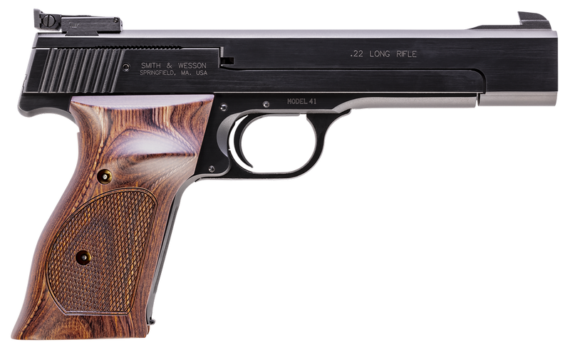 The Smith & Wesson Model 41 is a full-size target pistol chambered in .22 LR with a 5.5" precision button-rifled blued steel barrel and single-action trigger. It features checkered wood target grips, adjustable rear sight with undercut Patridge front sight, and a 10+1 round capacity, designed for competitive and recreational target shooting. The switch-barrel design allows for interchangeable 5.5" and 7" barrels on the same frame, weighing 41-46.4 oz.