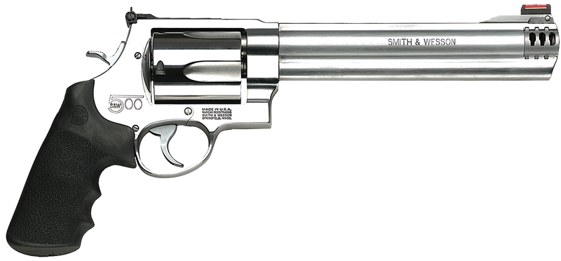 The Smith & Wesson Model 500 is a double/single action revolver chambered in .500 S&W Magnum with an 8.38" satin stainless steel compensated barrel and 5-round cylinder. This X-Large frame revolver features a black finger-grooved grip, exposed hammer, HiViz red dot front sight, and adjustable rear sight, with a total weight of approximately 69-72.5 oz. Designed for hunting or handgun silhouette shooting, it includes removable muzzle brakes and represents one of the most powerful production revolvers available.