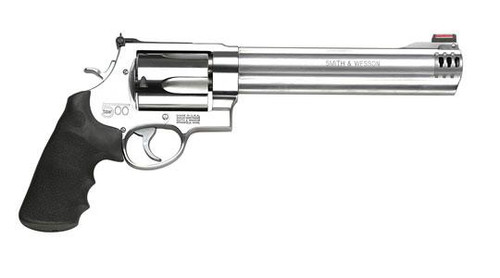 Smith & Wesson M500 X-Frame revolver chambered in .500 S&W Magnum with an 8.38" stainless steel barrel and 5-round capacity. This is the most powerful production revolver in the world, delivering 2600 ft/lb of muzzle energy with an effective muzzle compensator to manage recoil. Features adjustable rear sights, internal lock, and is rated for hunting any game; sold in used condition.