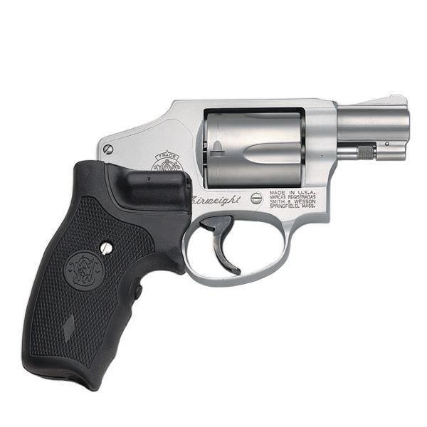 Smith & Wesson M642 Airweight revolver chambered in .38 Special +P with a 1.875" barrel and 5-round capacity. Features a matte silver stainless steel finish with aluminum alloy frame, fixed sights, and Crimson Trace Lasergrip for enhanced target acquisition. Overall length of 6.3" makes this J-Frame model suitable for concealed carry.