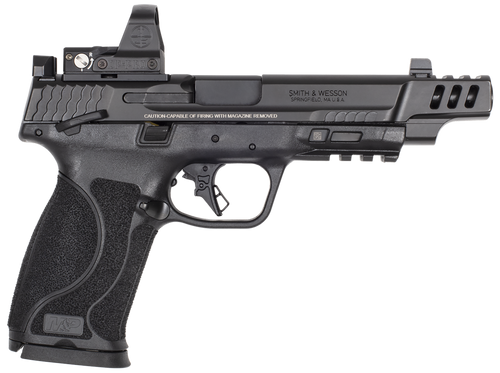 The Smith & Wesson M&P M2.0 Performance Center is a striker-fired semi-automatic pistol chambered in 10mm Auto with a 5.6" ported barrel and Black Armornite finish. Features an optics-ready slide with night sights, polymer frame with Picatinny rail, Performance Center-tuned flat trigger, and comes with two 15-round magazines. Weighs 31.4 oz with an overall length of 8.6".