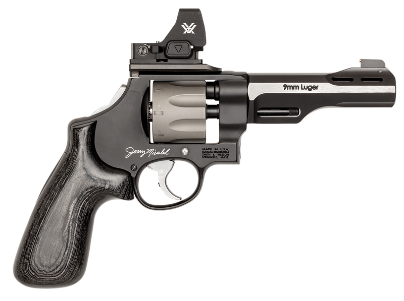 The Smith & Wesson Performance Center Model 327 is a double/single action revolver chambered in 9mm Luger with an 8-round capacity and 5" ported barrel. Features include a lightweight scandium alloy frame, titanium cylinder, Jerry Miculek signature black laminate grips, and a C.O.R.E. optic system with included Vortex CompDot red dot sight. The N-Frame revolver weighs 35.52 oz and measures 10.5" overall length.