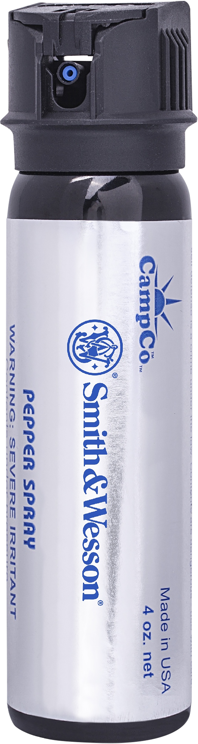 Smith & Wesson 4 oz OC pepper spray with flip-top safety mechanism and 15 ft effective range. Formulated with 15% OC pepper for personal protection against attackers. Housed in a durable plastic aerosol can design.