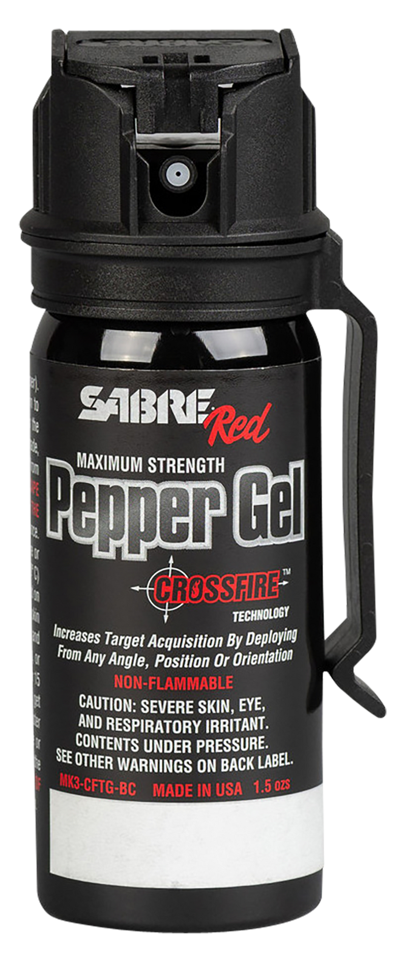 Sabre Crossfire is a 1.8 oz pepper gel spray with an 18 ft effective range, designed for personal protection against attackers. The gel formulation offers maximum strength OC spray backed by in-house lab testing, with a 4-year shelf life and includes a convenient belt clip for carry. This product is trusted by law enforcement agencies including NYPD and Chicago PD.