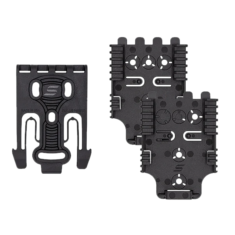 The Safariland Quick Locking System Kit is a black nylon accessory designed for holster attachment and customization. This kit includes components for rapid mounting and adjustment of compatible Safariland holsters. Dimensions are approximately 9.2" x 5.9" x 2.1".