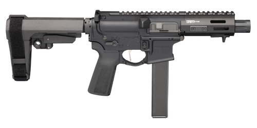 Semi-auto 9mm pistol with 5.5" barrel and 10+1 round capacity featuring a direct blowback system and SB Tactical SBA3 brace for enhanced stability. Includes full-length top Picatinny rail, SA 9mm Forward Blast Diverter, M-LOK free float handguard, and B5 Systems Type 23 P-Grip. Weighs 5 lbs 12 oz with overall length of 20"-22.5" depending on brace position.