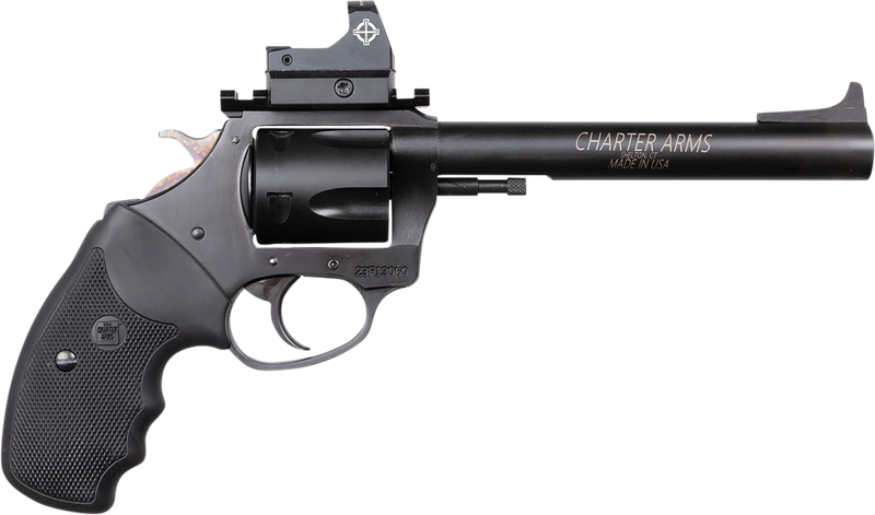 Charter Arms Mastiff Target is a large-frame revolver chambered in .44 Special with a 6" barrel and 5-round capacity. Features black nitride finish on stainless steel barrel and cylinder, black rubber grips, exposed hammer, and a Picatinny rail with included Sightmark Micro Optic. Dimensions: 13.1" L x 3.2" H x 9.6" W.