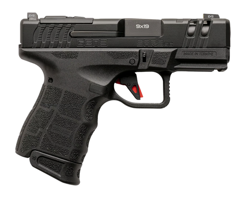 The SAR USA SAR9 is a 9mm striker-fired semi-automatic pistol chambered in 9mm with a 10+10 round capacity. This SOCOM model features a black finish and standard dimensions of 13.0" length, 9.5" width, and 2.5" height, making it suitable for duty or defensive carry.