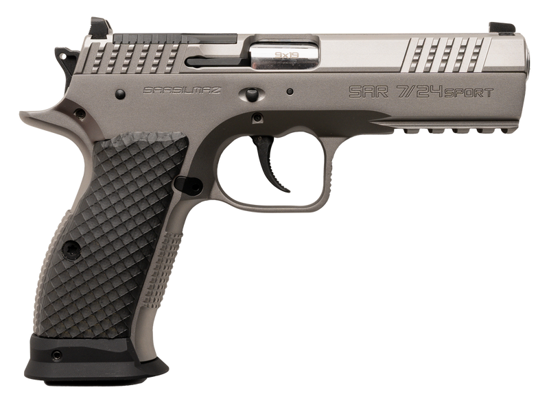 The SAR 7/24 Sport is a 9mm Luger semi-automatic pistol featuring a 4.4" stainless steel barrel with a double/single action trigger. This optics-ready model includes a matte stainless steel slide with serrations, steel frame with Picatinny rail and beavertail grip safety, and ships with two 17-round magazines.
