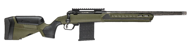 This Savage Arms 110 Ultralite Predator is a bolt-action rifle chambered in 5.56 NATO with an 18" carbon fiber barrel and threaded muzzle (1/2x28). Featuring a hunter green synthetic stock with adjustable length of pull and comb, it includes interchangeable grip modules, M-Lok panels, and an integral ARCA rail. The action is Black Cerakote finished with a skeletonized receiver and threaded bolt handle, while the user-adjustable AccuTrigger and one-piece 0 MOA rail provide crisp trigger breaks and optic mounting, weighing just 7.3 lbs.
