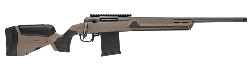The Savage 110 Core Tactical is a bolt-action rifle chambered in 6mm ARC with an 18" straight fluted and threaded barrel (5/8x24). This precision-ready platform features a Coyote Tan synthetic stock with adjustable length-of-pull and comb, a one-piece 20 MOA optic rail, integral ARCA rail, M-Lok panels, AccuTrigger, and interchangeable grip modules. Weighing 8.3 lbs with an overall length of 38.26", it ships with one 10-round AICS magazine and is drilled and tapped for optics mounting.
