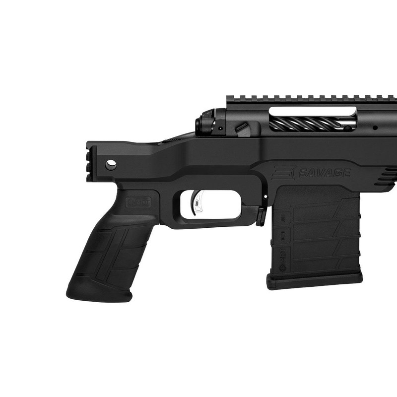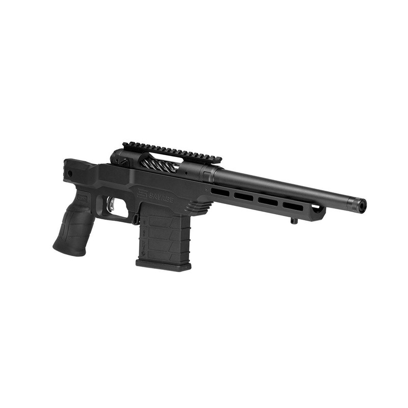 The Savage 110 PCS is a bolt-action pistol chambered in 400 Legend with a 10.5" threaded barrel and user-adjustable AccuTrigger. Built on Savage's factory blueprinted 110 action secured in a one-piece aluminum MDT chassis, it features a 0 MOA Picatinny rail system, AICS-style detachable magazine, and weighs 5.6 lbs. This compact platform combines the Model 110's accuracy and reliability in a modern, modular chassis design.