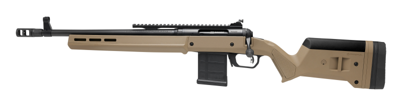 The Savage Arms 110 Scout is a left-hand bolt-action rifle chambered in 450 Bushmaster with a 16.5" threaded barrel and 5+1 capacity. It features a Picatinny rail for optic mounting, AccuTrigger, adjustable iron sights, and a Magpul Hunter synthetic stock in Flat Dark Earth, weighing 8.4 lbs with an overall length of 38.5".