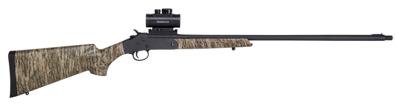 Single-shot break-action shotgun chambered in .410 Bore with a 3" chamber and 26" barrel optimized for HEAVYWEIGHT TSS turkey loads. Features a Mossy Oak Bottomland synthetic stock with matte black barrel, includes a 1x30 red dot sight and extra-full choke tube, weighs 5.07 lbs with an overall length of 41.5".