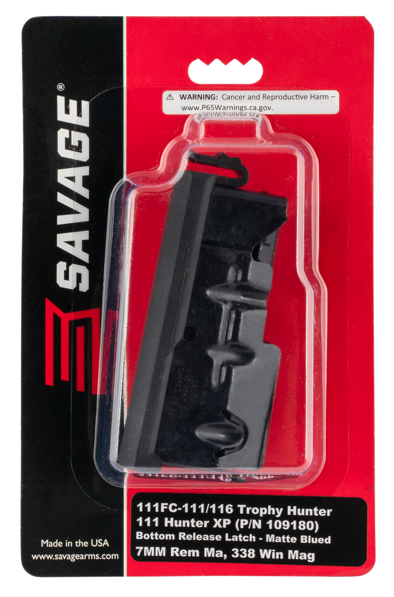 Savage Arms detachable magazine chambered for 7mm Remington Magnum and .338 Winchester Magnum with 3-round capacity. Constructed of steel with matte blue finish, this magazine fits Savage Axis, Axis II, 110 Trail Hunter, 110 Apex Hunter XP, 110 Hog Hunter, and 110 Ultralite rifles. Features integral release mechanism for reliable operation.