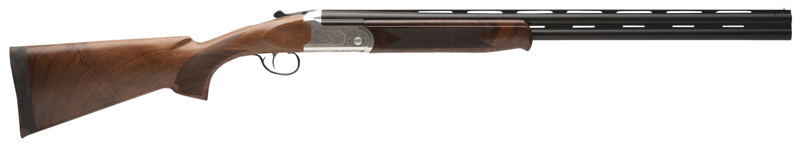 The Stevens 555E is a 20 gauge over/under shotgun featuring a 26" barrel with ventilated rib, 3" chamber, and 2-round capacity. It includes an engraved aluminum receiver, imperial walnut stock, ambidextrous design, single selective mechanical trigger, and five interchangeable choke tubes (C, IC, M, IM, F). Weighing 5.85 lbs with an overall length of 43.31", this shotgun combines lightweight handling with durable construction ideal for hunting and sport shooting.