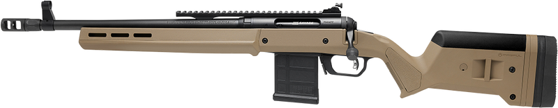 Savage Arms 110 Scout in 350 Legend with a 16.50" threaded barrel in Flat Dark Earth finish and bolt-action. Features a Magpul Hunter synthetic stock, Picatinny rail, adjustable iron sights, AccuTrigger, and 10+1 capacity. Left-hand configuration, weighs 8.40 lbs, with carbon steel receiver.