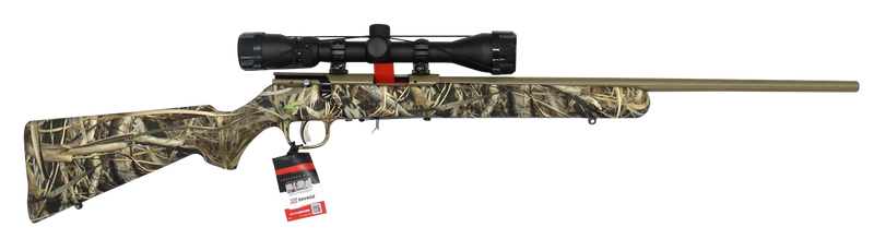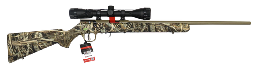 Savage Arms 93 XP bolt-action rifle chambered in 22 WMR with a 21" button-rifled barrel and 10+1 capacity. Features a drilled and tapped steel receiver, AccuTrigger, brush camouflage synthetic stock, and comes mounted with a Weaver 3-9x40mm scope. Weighs 6.2 lbs with an overall length of 39.75".