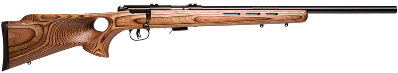 The Savage Arms 93R17 BTV is a bolt-action rimfire rifle chambered in 17 HMR with a 21" heavy button-rifled barrel and 5+1 capacity. It features a brown laminate thumbhole stock, AccuTrigger, and matte blued finish, weighing 7 lbs with no factory sights. Designed for hunting and target shooting applications.