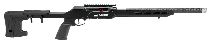 Semi-automatic rimfire rifle chambered in .22 LR with an 18" carbon fiber-wrapped threaded barrel and 10+1 capacity. Features a custom MDT one-piece aluminum chassis with adjustable cheek riser and length-of-pull spacers, Picatinny rail, oversized charging handle, and Savage's AccuTrigger system. Weighs 6.77 lbs and measures 37.25" overall.
