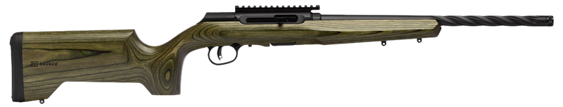 The Savage Arms A22 Timber Tactical is a .22 LR semi-automatic rifle featuring an 18" spiral fluted threaded barrel with 1/2x28 thread pattern and 10+1 round capacity. It includes a black matte carbon steel receiver with Picatinny rail, OD green fixed laminate stock, AccuTrigger, and weighs 6.6 lbs. This right-hand rifle is ideal for precision shooting and training with its threaded barrel design and optic-ready platform.