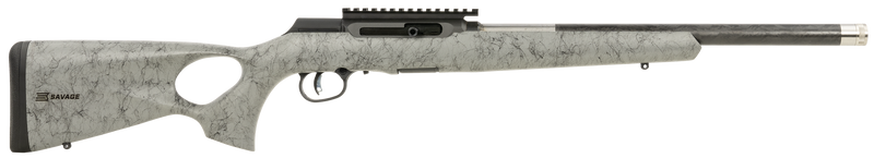 The Savage Arms A22 Timberlite Thumbhole is a semi-automatic .22 LR rifle with an 18" carbon fiber-wrapped threaded barrel and gray synthetic stock with black spiderweb pattern. It features an AccuTrigger, 20 MOA Picatinny rail, and weighs 5.3 lbs, making it ideal for rimfire enthusiasts seeking precision and lightweight handling. Ships with one 10-round rotary magazine.
