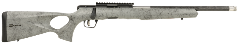 Savage Arms B17 Timberlite Thumbhole is a bolt-action rimfire rifle chambered in .17 HMR with an 18" carbon fiber-wrapped threaded barrel (1/2x28), 10+1 capacity, and weighs 5.3 lbs. Features include a gray synthetic thumbhole stock with black webbing, 20 MOA Picatinny rail, and user-adjustable AccuTrigger (2.5-6 lb). Overall length is 36" with a matte black finish and comes drilled and tapped for optics.