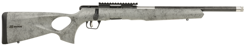 Savage Arms B22 Timberlite Thumbhole is a .22 LR bolt-action rifle with an 18" carbon fiber threaded barrel and 10+1 capacity. Features an ambidextrous gray thumbhole stock with black spiderweb webbing, 20 MOA Picatinny rail, and user-adjustable AccuTrigger. Weighs 5.3 lbs with an overall length of 36".