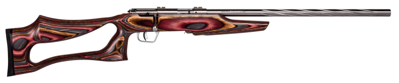 The Savage Arms Mark II BSEV is a .22 LR bolt-action rifle with a 21-inch spiral-fluted stainless steel barrel and 5+1 capacity, designed for both hunting and target shooting. It features a user-adjustable AccuTrigger for customized trigger pulls and a wood laminate Evolution thumbhole stock with skeletonized design. Weighing 6.95 lbs with an overall length of 40 inches, the rifle is drilled and tapped for optics and offers exceptional accuracy through its button-rifled heavy barrel.