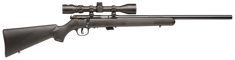 The Savage Arms Mark II FVXP is a bolt-action rifle chambered in 22 LR with a 21-inch button-rifled carbon steel barrel and 5+1 capacity. It features an adjustable AccuTrigger for customized trigger pulls, drilled and tapped receiver for optics, and comes factory-mounted with a 3-9x40mm scope. The rifle weighs 5.7 lbs and features a matte blued barrel with a black synthetic fixed stock, making it suitable for hunting and target shooting.