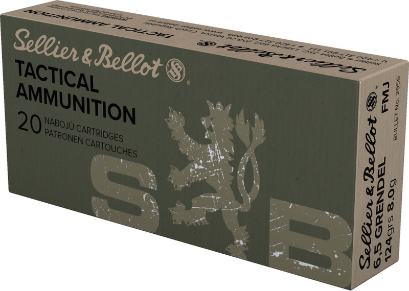 Sellier & Bellot 6.5 Grendel ammunition loaded with 124 grain Full Metal Jacket bullets featuring a lead core and CuZn 10 metallic jacket. Suitable for competitive target shooting, hunting applications, and general rifle use with a ballistic coefficient of 0.400 (G1) and muzzle velocity of 2,576 fps.