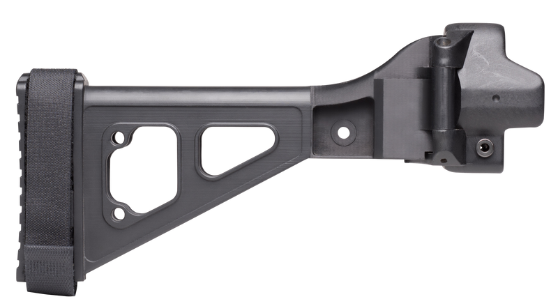 The SBT5 is a side-folding polymer stabilizing brace designed for HK MP5/MP5K and compatible clones in 9mm, featuring a molded polymer end cap with QD socket and integral side-folding mechanism. This complete ready-to-install assembly includes an adjustable nylon strap and is US veteran designed and proudly made in the USA. Dimensions are approximately 11.3" length with 1.0" strap width and weighs 13.5 oz.