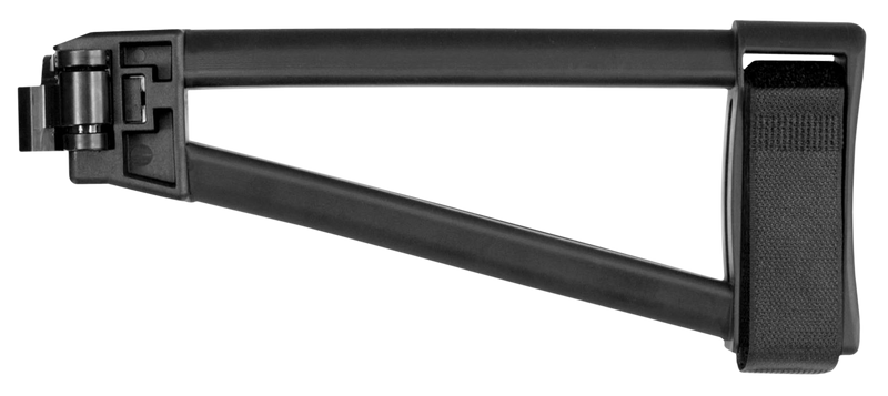 A side-folding stabilizing brace designed for AR-platform firearms with M1913 Picatinny rail interface at the rear receiver. Features an advanced steel hinge design that locks in both folded and extended positions, rigid polymer substrate with flexible arm cuff, and adjustable nylon strap for secure attachment. The pull-through design enables quick deployment with an overall length of 9.5 inches when extended.