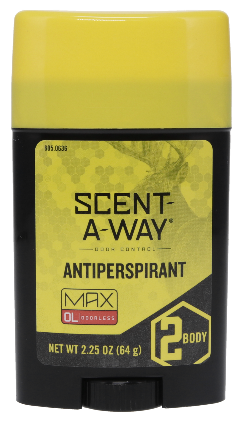Scent-A-Way Max is an odorless antiperspirant stick that controls bacterial odors while absorbing and reducing moisture, containing no added fragrances. The 2.25 oz stick provides effective odor elimination for up to 24 hours. Designed for hunters who need to minimize human scent detection during hunting activities.