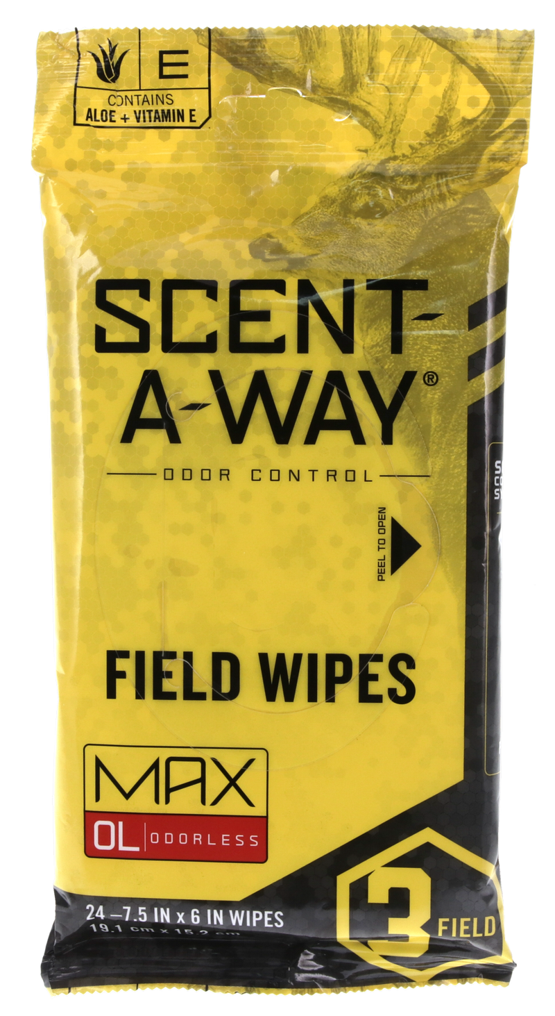 Scent-A-Way Max Field Wipes are alcohol-free wipes containing aloe vera and vitamin E to eliminate human and environmental odors using a proprietary enzymatic formulation. These fragrance-free, odorless wipes are designed for sensitive skin and come in a package of 24. Ideal for hunting and outdoor use where scent control is critical.