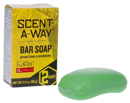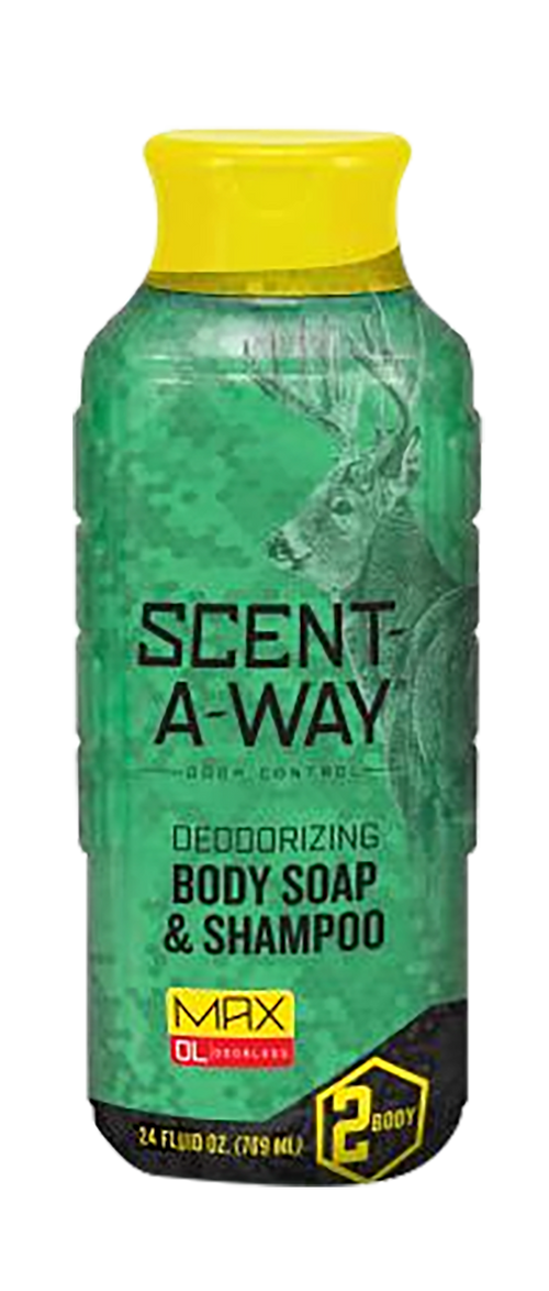 Scent-A-Way Max is an odorless liquid body soap and shampoo formulated with natural vegetable proteins to eliminate body odors for hunters, trappers, anglers, and campers. The soap includes honeyquat for hydration and aloe vera for skin and hair care, and is biodegradable and environmentally friendly. Available in a 12 oz bottle.