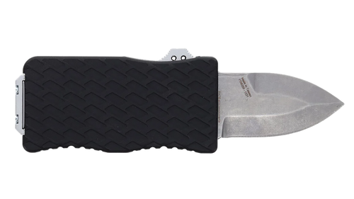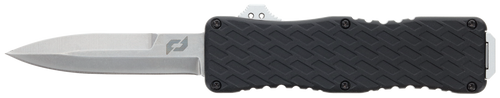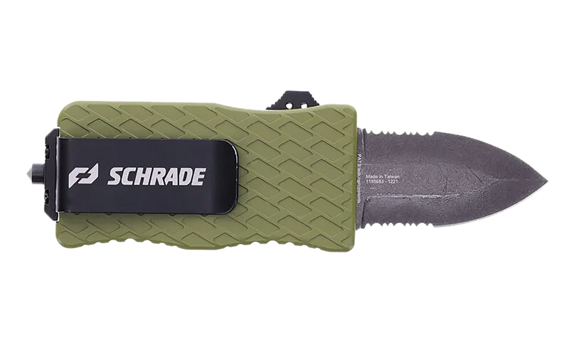 The Schrade Uproar Tactical Mini features a 1.90" serrated dagger point blade made from D2 steel with a satin finish. This OTF (out-the-front) design includes an OD green aluminum handle and weighs 2.90 oz, with an overall length of 5.50". Designed as a compact tactical knife for everyday carry and utility purposes.