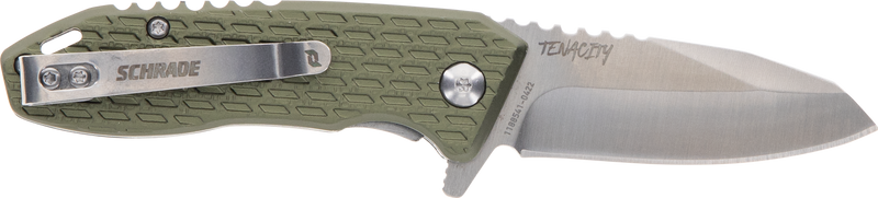 The Schrade Tenacity is a folding knife featuring a modified drop point blade made of AUS-10A stainless steel with partial serration for versatile cutting tasks. It has a green aluminum handle and measures 11.0 inches in length when open, weighing 3.40 oz. This knife is designed for general outdoor and utility use.
