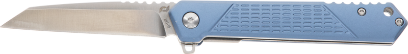 The Schrade Inert is a compact EDC folding knife featuring a 3.25" AUS-10A stainless steel Wharncliffe blade with partial serration and satin finish. The blue aluminum handle is ergonomic and lightweight at 3.30 oz, with a thumb disk opening mechanism and 7.5" overall length when open.