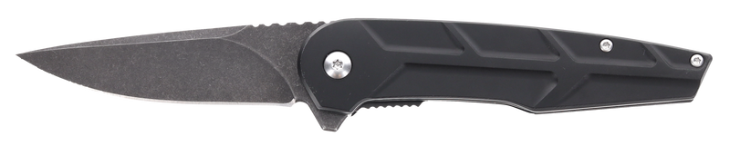 The Schrade Reckon is a spring-assisted folding knife featuring a 3.25" drop point D2 steel blade with a dark stonewash finish. It has a black aluminum handle with a liner locking system and measures 7.6" overall when open, weighing 3.8 oz. Assembled in the USA, this knife is designed for general cutting tasks and everyday carry.