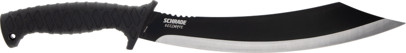 The Schrade Decimate Parang is an 11.75" fixed blade knife with a 3Cr13 steel blade featuring a black oxide finish. It features a 6.75" black rubber overmold handle and comes with a polyester sheath, with an overall length of 18.25" and weighing 17.80 oz.