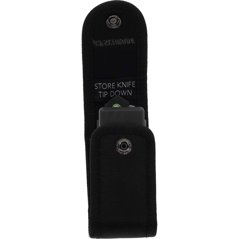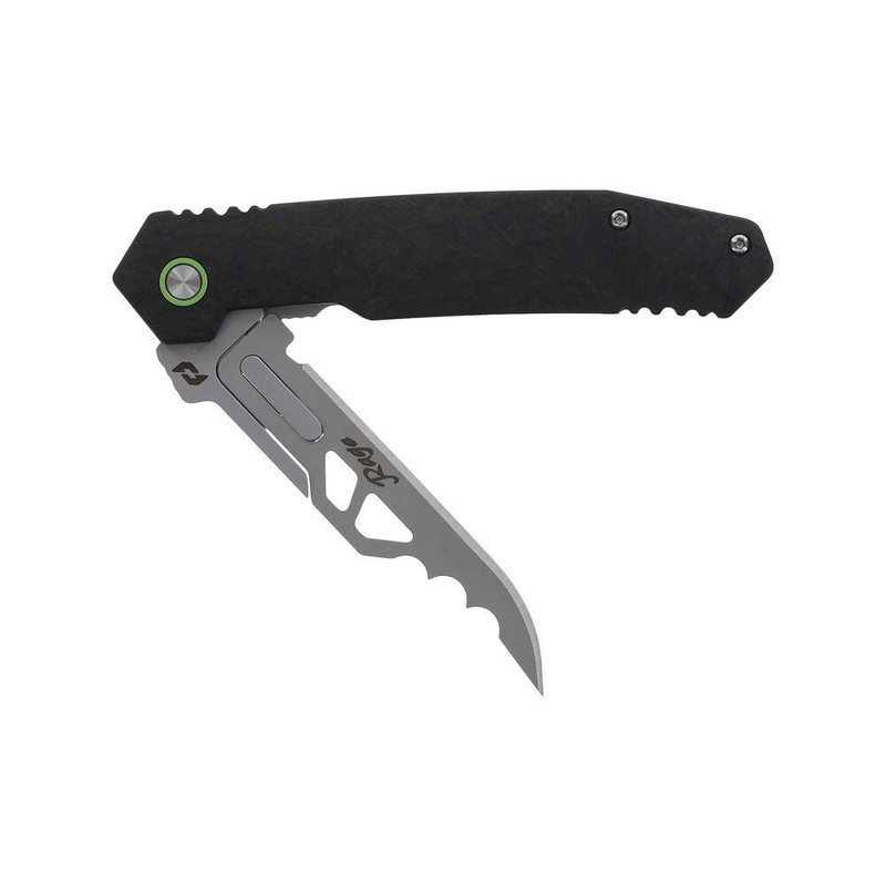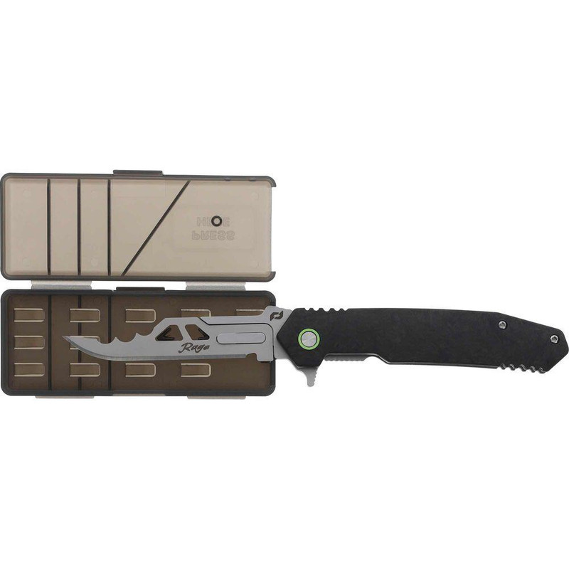 The Schrade Enrage Series combines replaceable blade technology with Rage broadhead design, featuring a 2.2" razor-sharp replaceable blade and 3.5" carbon fiber handle. This fixed blade knife weighs 2 oz and is suitable for everyday carry or hunting applications. The frame lock design and satin finish blade ensure reliable performance in the field.