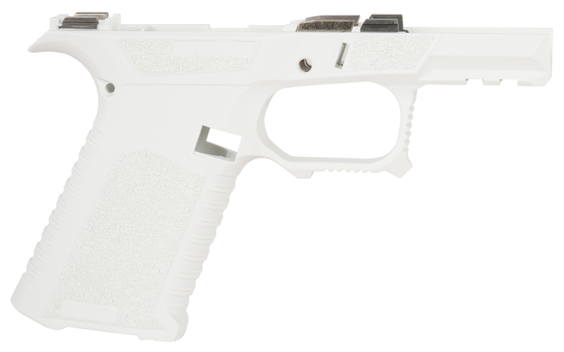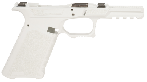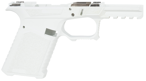 SCT Manufacturing 02C frame assembly with integrated locking block. Dimensions: 9.6" L x 6.0" W x 1.2" H. This handgun frame component is designed for semi-automatic pistol builds and comes finished in white.