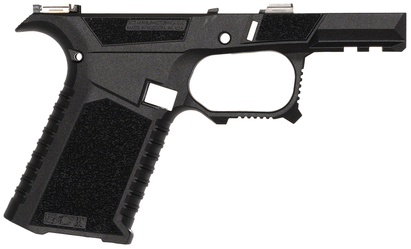SCT Manufacturing polymer frame designed for Glock 43X/48 compatibility. Features black stainless steel finish with aggressive texture grip and includes locking block. Dimensions: 9.6" length x 6.0" width x 1.2" height.