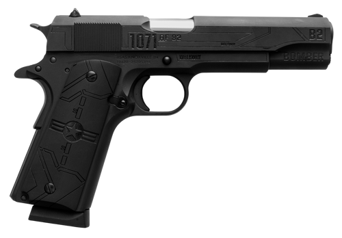 Semi-auto pistol chambered in 45 ACP with a 5" stainless barrel and 8+1 round capacity. Features a QPQ Tennifer finish, adjustable rear sights, Turkish walnut grips with logo, and checkered front strap with beavertail. Includes two 8-round magazines and weighs 2 lbs 7 oz.