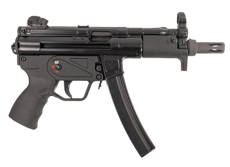 The MAC 5K is a semi-automatic pistol chambered in 9mm Luger with a 5.8" black phosphate threaded steel barrel and 30+1 round capacity. Features include roller-delayed blowback action, optics-ready receiver, ambidextrous controls, adjustable diopter sights, and compatibility with HK-style accessories. Includes two 30-round magazines, sling, flash hider, and cleaning kit; weighs 4.6 lbs with an overall length of 13.7".