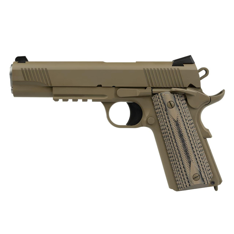 The Tisas 1911 Raider is a full-size semi-automatic pistol chambered in .45 ACP with a 5-inch cold hammer-forged barrel and 8-round capacity. It features an FDE Cerakote finish, Picatinny rail on the frame, Novak-style 3-dot sights, and textured G10 grips, weighing 2 lbs 4 oz. Internals are based on the Colt 70 Series design, making it a modern M45A1-inspired combat pistol.