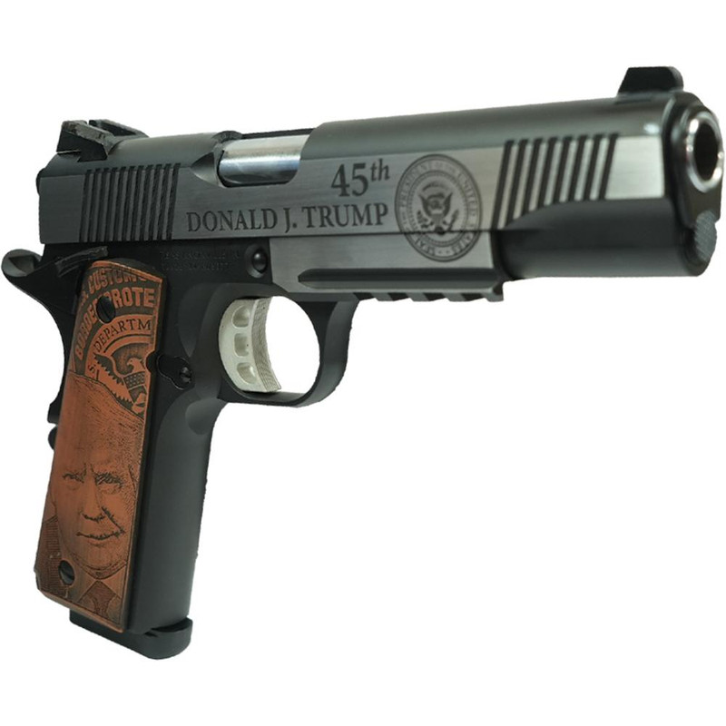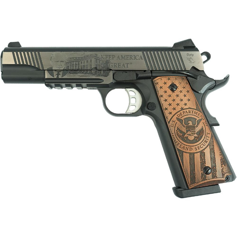 Semi-automatic 1911-pattern pistol chambered in .45 ACP with a 5" hammer-forged chrome-plated barrel and 8-round capacity. Features a full-size stainless steel frame with M1913 rail, forward serrations on the slide, Novak-style combat sights, extended beavertail grip safety, and skeletonized hammer and trigger. This modernized 1911 variant includes a flared and lowered ejection port for improved reliability.