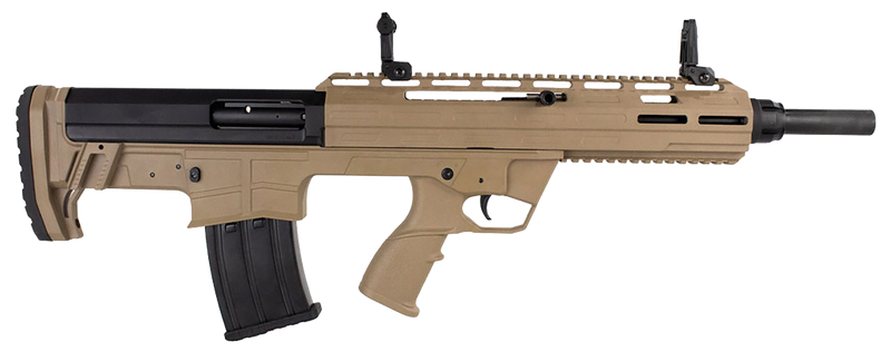 The Tokarev USA TBP is a bullpup semi-automatic shotgun chambered in 12 Gauge with a 3" chamber, 18.5" barrel, and 5+1 round capacity. The compact bullpup configuration reduces overall length while maintaining a full-length barrel and features flip-up sights, a cheek riser-compatible synthetic stock, and includes three chokes (F, M, IC). The FDE finish package includes multiple 1913 Picatinny rails for mounting optics and accessories, and the shotgun weighs 7.5 lbs.