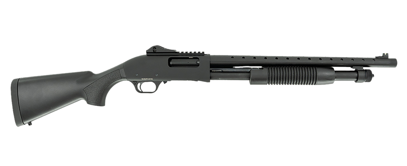 The Tokarev TX3 12A1 is a pump-action 12 gauge shotgun with a 3" chamber, 18.5" chrome-lined barrel, and 5+1 capacity, designed for home defense and range use. It features dual action bars, a ventilated heat shield, integrated Weaver rail with ghost-ring rear and fiber-optic front sights, and a Picatinny rail for optics mounting. The synthetic black polymer stock and forearm are compatible with Mossberg 500/590 furniture, weighs 6.1 lbs, and measures 38" overall.